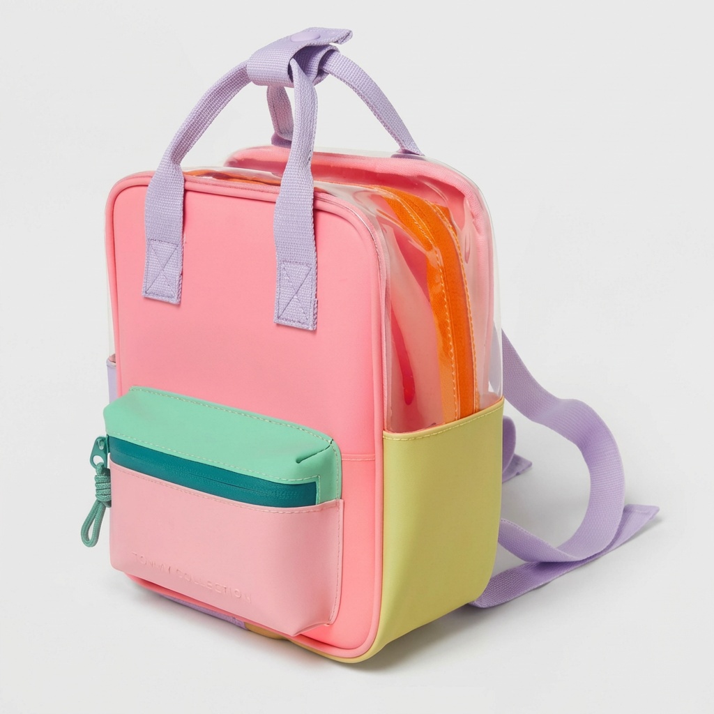 Mehrfarbiger Rucksack mit dominierenden Tönen in Rosa, Violett, Gelb und Grün. Die textile Polyester-Konstruktion gewährleistet Langlebigkeit und Widerstandsfähigkeit für den täglichen Gebrauch. Das durchdachte Fächersystem mit Reißverschlüssen erleichtert die Organisation des Inhalts.