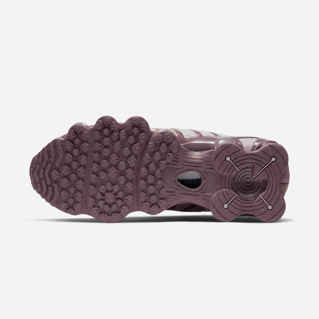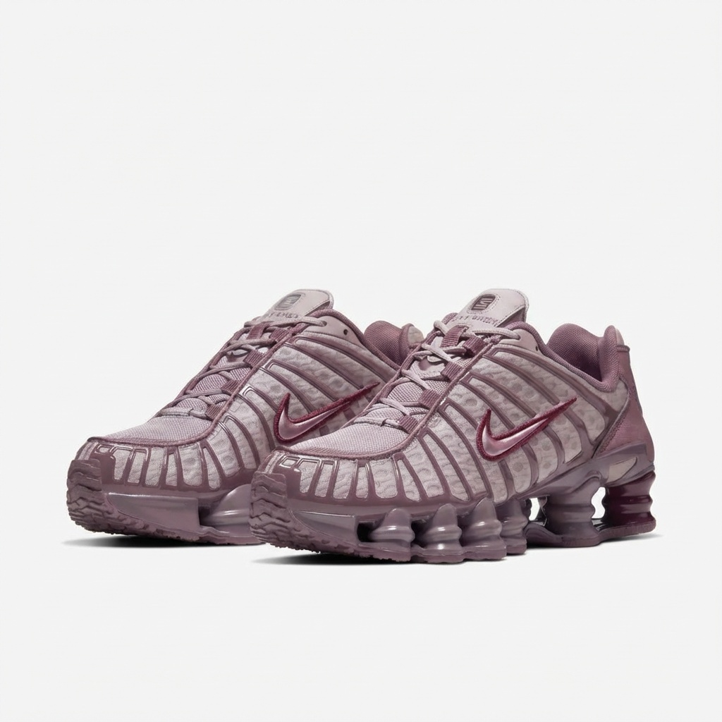 Nike Shox TL es un modelo que combina diseño futurista con tecnología avanzada de amortiguación. La coloración Pumice Night Maroon presenta delicadas transiciones desde tonos rosas en el upper hasta acentos violetas más profundos. Las características columnas Shox en la suela constituyen el punto visual central de la zapatilla.