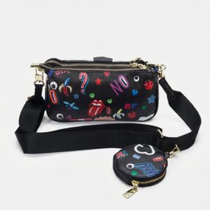 Besace fonctionnelle avec sacoche attachée alliant praticité et design expressif. Base noire ornée de motifs colorés – lèvres, yeux, symboles musicaux et inscriptions – créant un motif contrasté. Le cuir ECO associé au polyester garantit durabilité et résistance à l’usage quotidien.