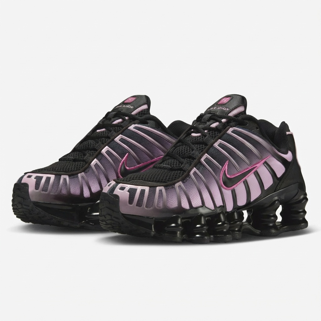 NIKE Shox TL Black Playful Pink è un modello che combina una base nera con dettagli rosa in una transizione graduale dei colori. Le scarpe sono dotate del sistema di ammortizzazione proprietario Shox con quattro colonne nella parte posteriore della suola e del caratteristico logo Nike Swoosh in colore rosa. La costruzione tessile-sintetica della tomaia garantisce durata e un’adeguata vestibilità al piede.