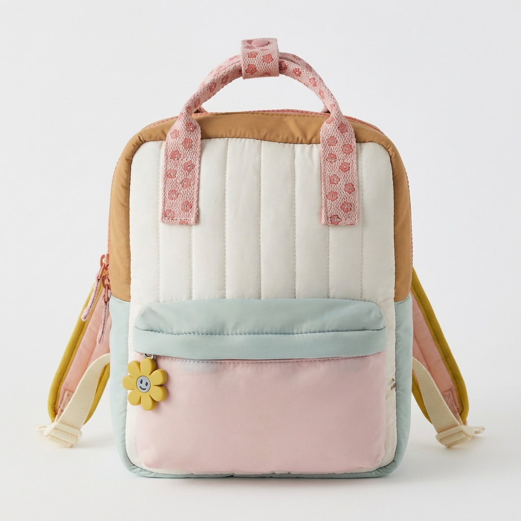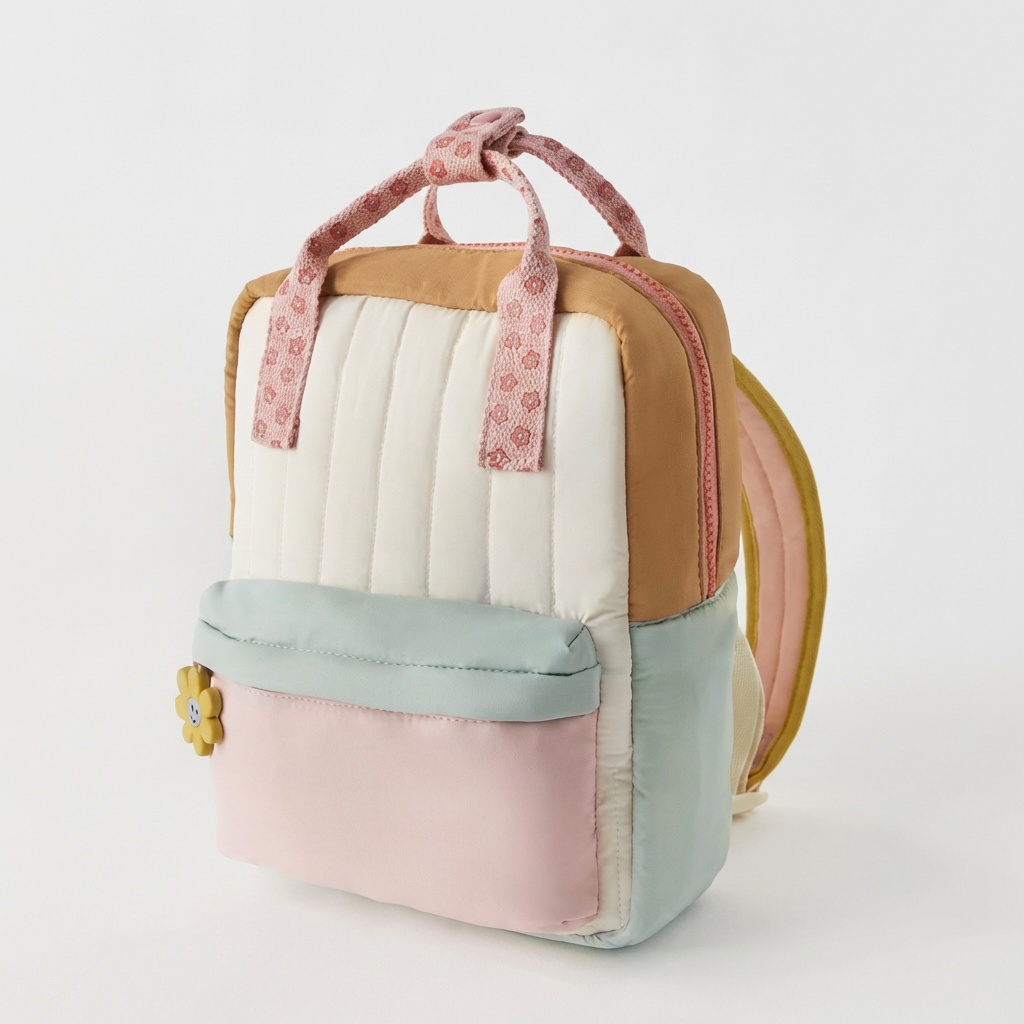Zaino designer con pannelli contrastanti in beige, rosa e caramello. Realizzato in poliestere resistente con numerosi scomparti funzionali. Le cinghie regolabili con nastro decorato garantiscono comfort durante l’uso.