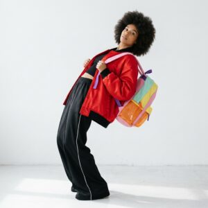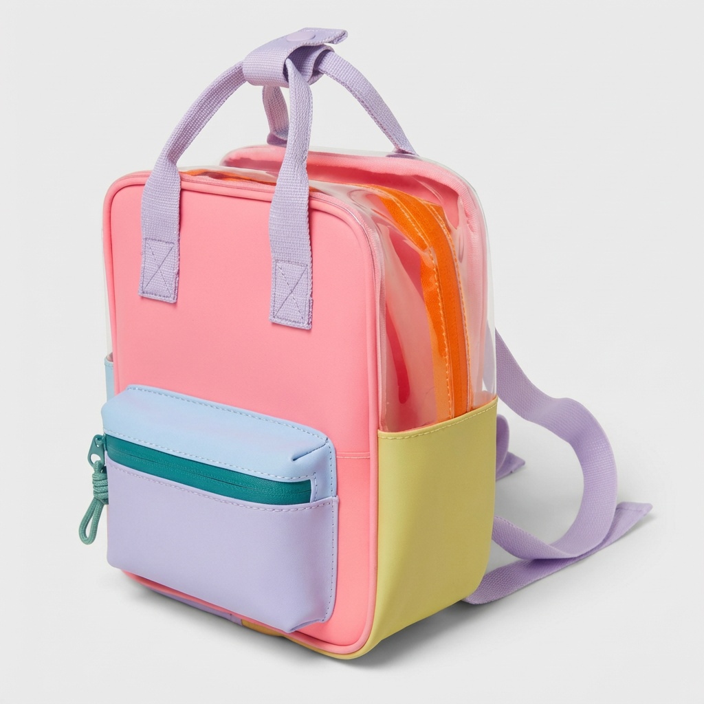 Veelkleurige rugzak met dominante tinten roze, paars, geel en groen. Textielconstructie van polyester zorgt voor duurzaamheid en weerstand tegen dagelijks gebruik. Doordacht systeem van compartimenten met ritsen vergemakkelijkt de organisatie van de inhoud.