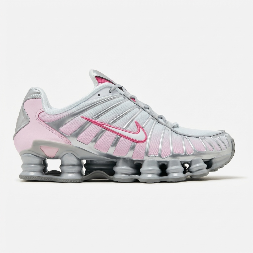 De NIKE Shox TL schoenen in Rose Foam-kleurstelling combineren een zilveren basis met roze accenten. Karakteristieke Shox-kolommen in de zool zorgen voor demping bij elke stap. Het bovenwerk van textiel en synthetische materialen garandeert duurzaamheid en ventilatie.