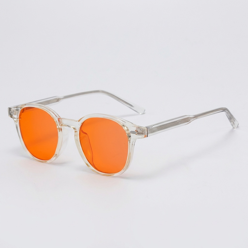 Zonnebrillen van het merk MoMyy combineren functionaliteit met expressief design. Het transparante polymeer montuur contrasteert met intensief oranje glazen die UV400 filter bieden. Het model kenmerkt zich door een klassieke vorm met subtiel afgeronde randen en delicate metalen elementen bij de neusbrug.