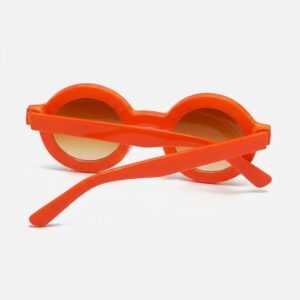 Ronde zonnebril in opvallende oranje kleur van de monturen. Bruine glazen met verloop effect bieden UV400 bescherming tegen schadelijke straling. Polymeer constructie garandeert lichtheid en draagcomfort de hele dag.