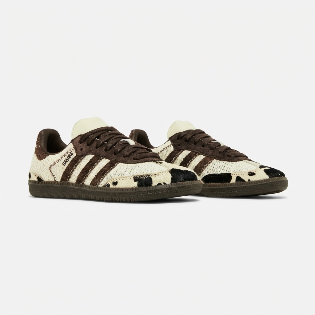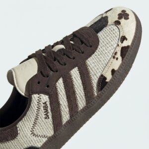 Model Samba OG otrzymał artystyczną interpretację z motywem krowy, łącząc klasyczną sylwetkę z odważnym designem. Cholewka wykonana z kombinacji skóry naturalnej i materiału tekstylnego zapewnia trwałość i komfort noszenia. Charakterystyczne trzypaskowe logo Adidas w odcieniu brązowym harmonijnie komponuje się z całością projektu.