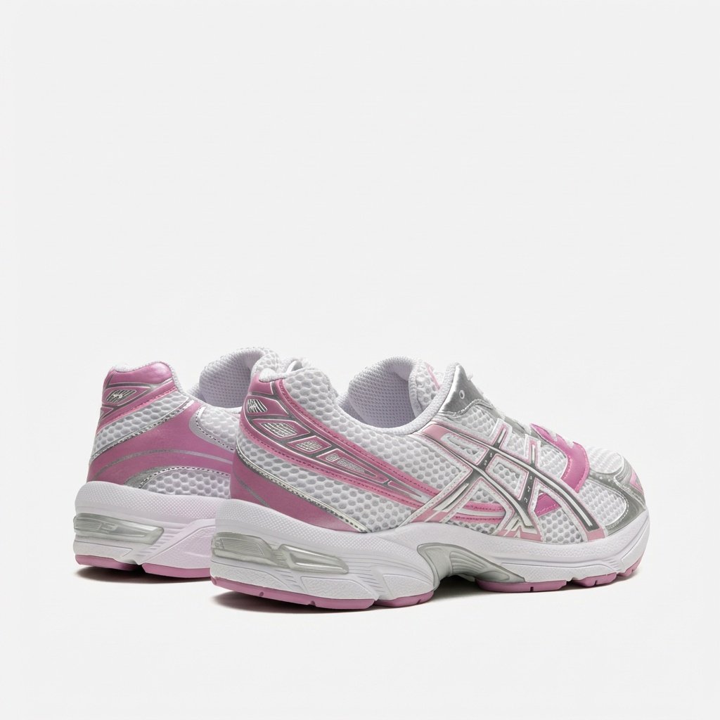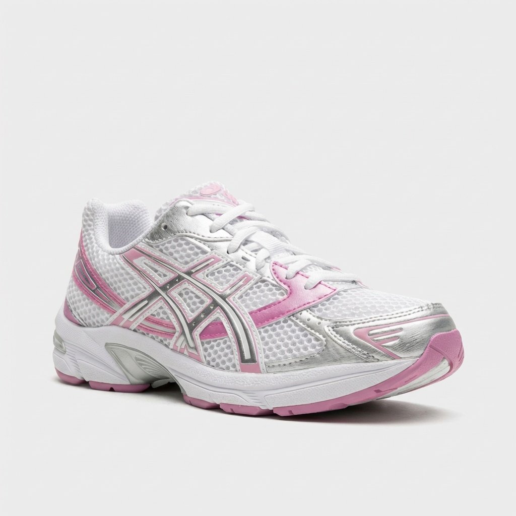 Buty sportowe ASICS GEL-1130 w kolorystyce białej z różowymi i srebrnymi akcentami. Wykonane z materiałów tekstylnych i syntetycznych. Model łączy funkcjonalność sportową z codziennym stylem.