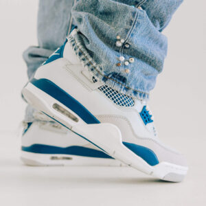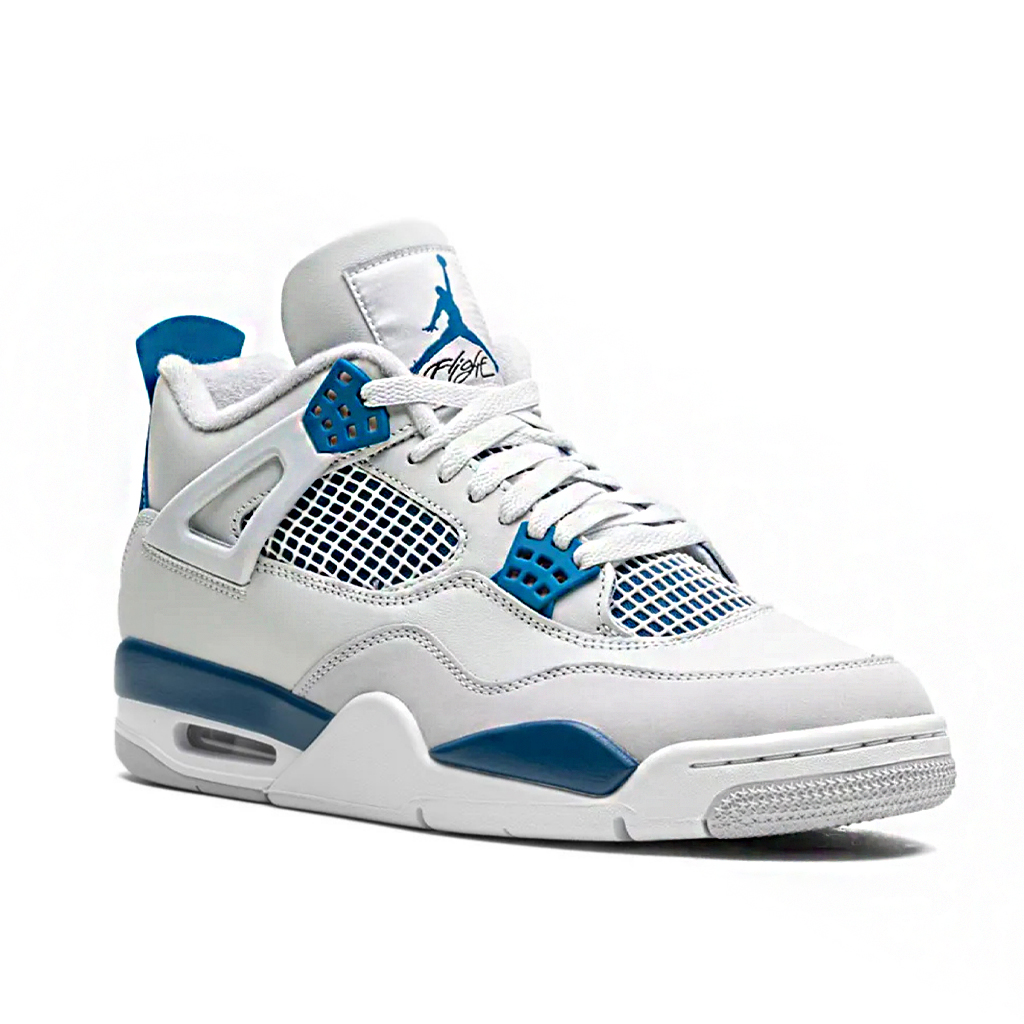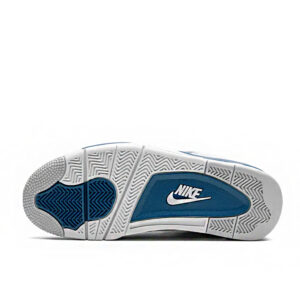 Cholewka wykonana z premium skóry naturalnej w bieli zapewnia trwałość i czysty, ponadczasowy wygląd. Charakterystyczne elementy Jordan 4 – takie jak siateczkowe panele, plastikowe skrzydełka i kontrastowe akcenty Military Blue – podkreślają oryginalne DNA modelu.