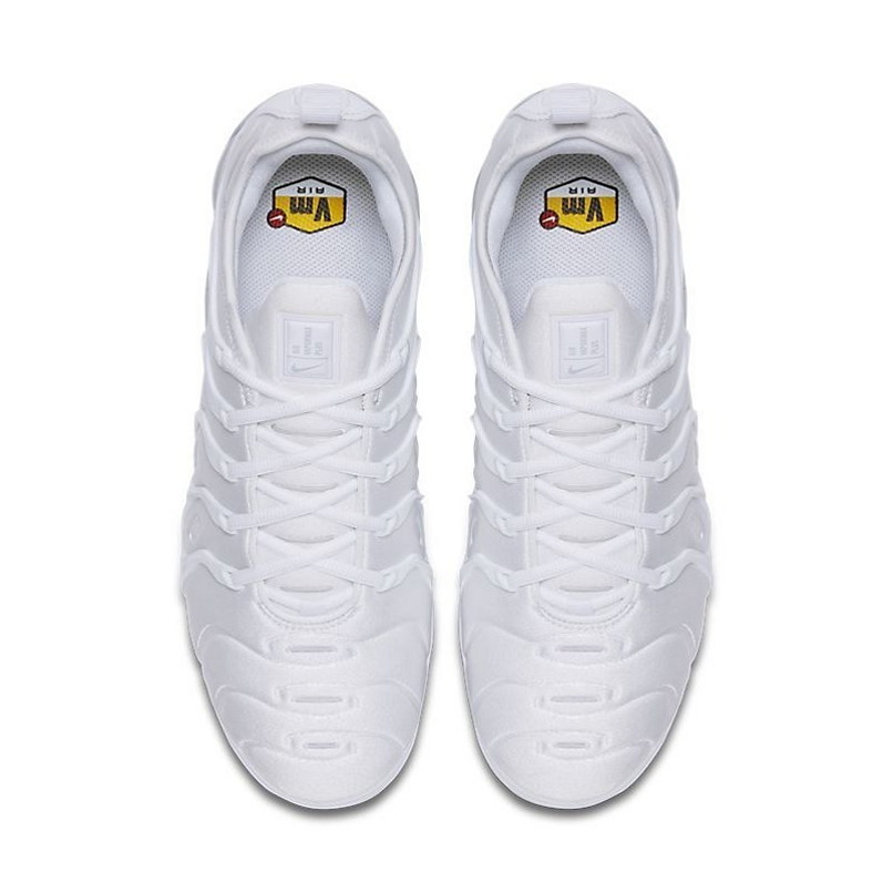 Nike Air VaporMax Plus 924453-100 to hybrydowe sneakersy łączące cholewkę inspirowaną Air Max Plus z amortyzacją VaporMax Air. Tekstylna cholewka z falistymi wzmocnieniami TPU stabilnie obejmuje stopę, a miękka wyściółka tekstylna wspiera komfort noszenia. Pełnowymiarowa podeszwa VaporMax Air zapewnia sprężyste, lekkie odczucia pod stopą. Czysta, biała kolorystyka podkreśla minimalistyczny charakter i łatwo łączy się z garderobą. Sylwetka nawiązuje do wydania z 1998 roku, łącząc klasyczne linie z nowoczesną konstrukcją podeszwy.