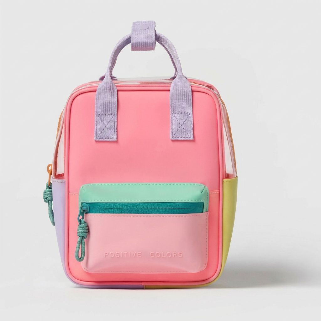 Wielokolorowy plecak z dominującymi odcieniami różu, fioletu, żółci i zieleni. Tekstylna konstrukcja z poliestru zapewnia trwałość i odporność na codzienne użytkowanie. Przemyślany system przegród z suwakami ułatwia organizację zawartości.