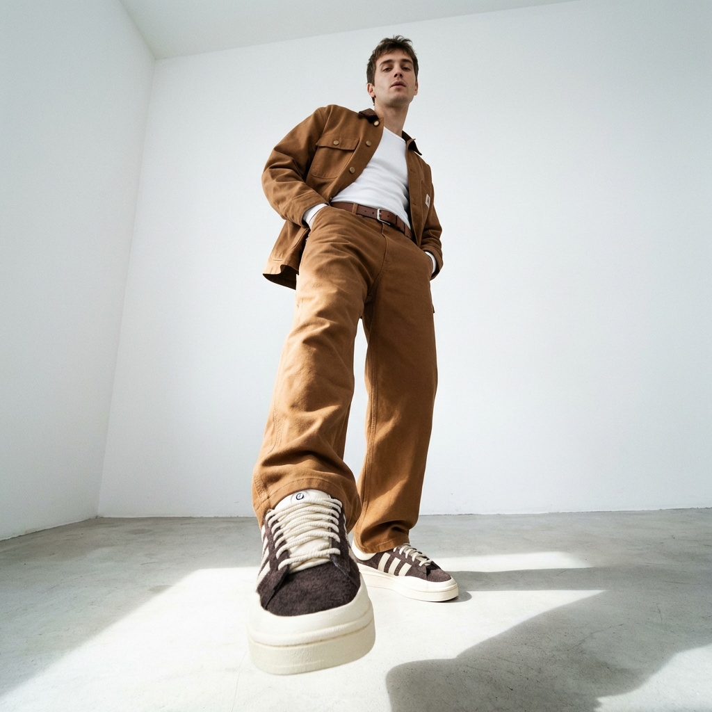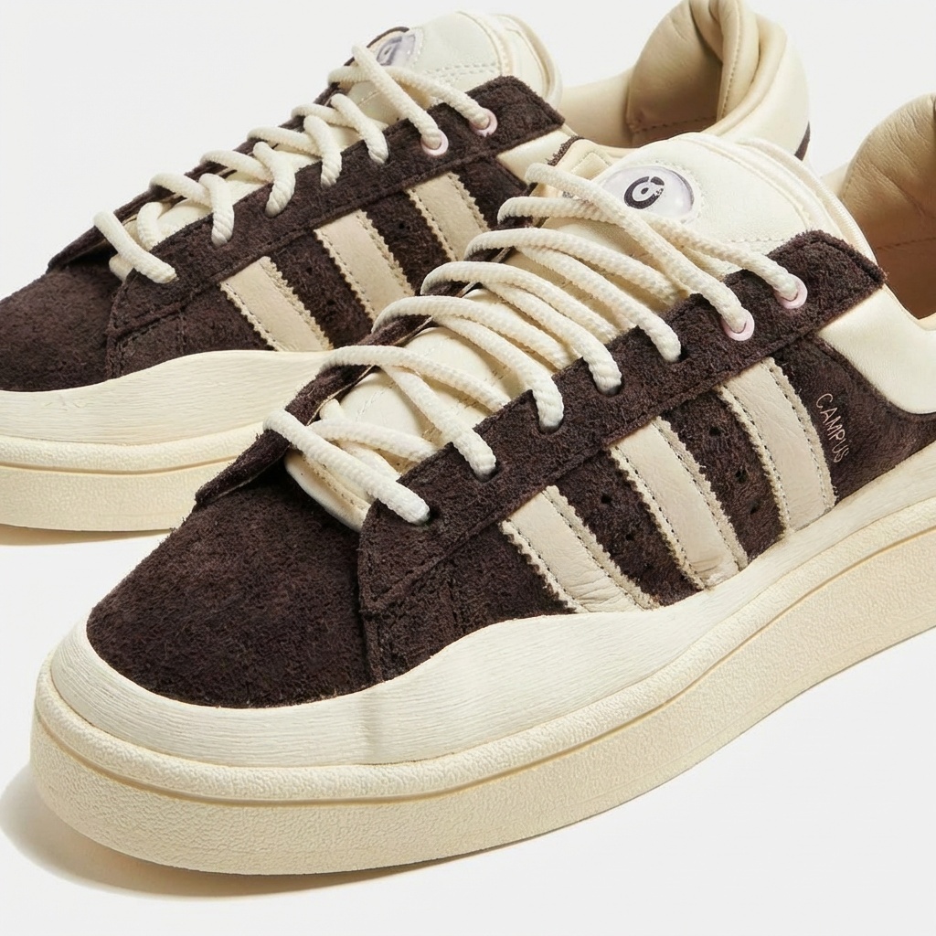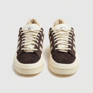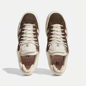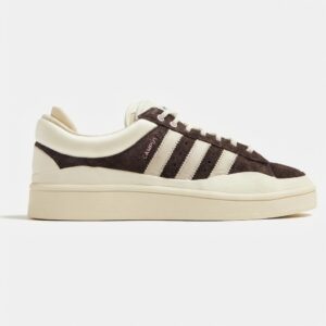 Campus sneakers from the limited Bad Bunny ‘The Last Campus’ collection combine classic design with contemporary streetwear approach. Upper crafted from soft suede material in brown shade, complemented by beige elements and characteristic brand three stripes. Model features contrasting laces and vintage sole with thick profile.