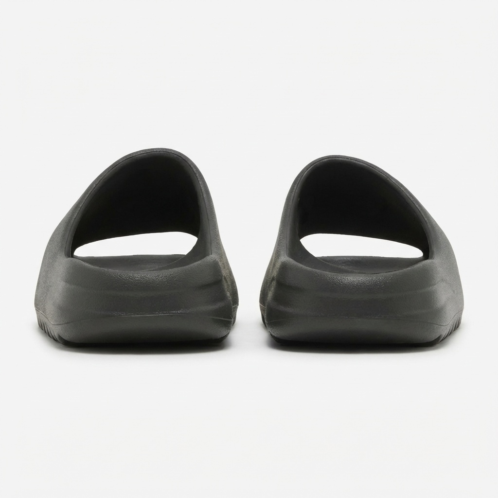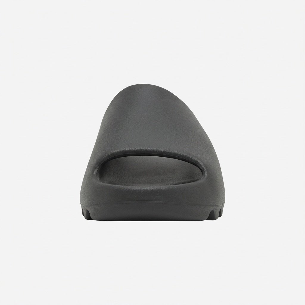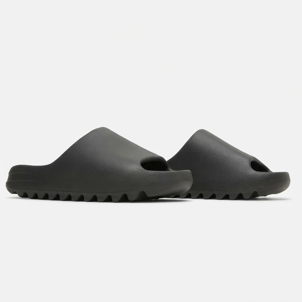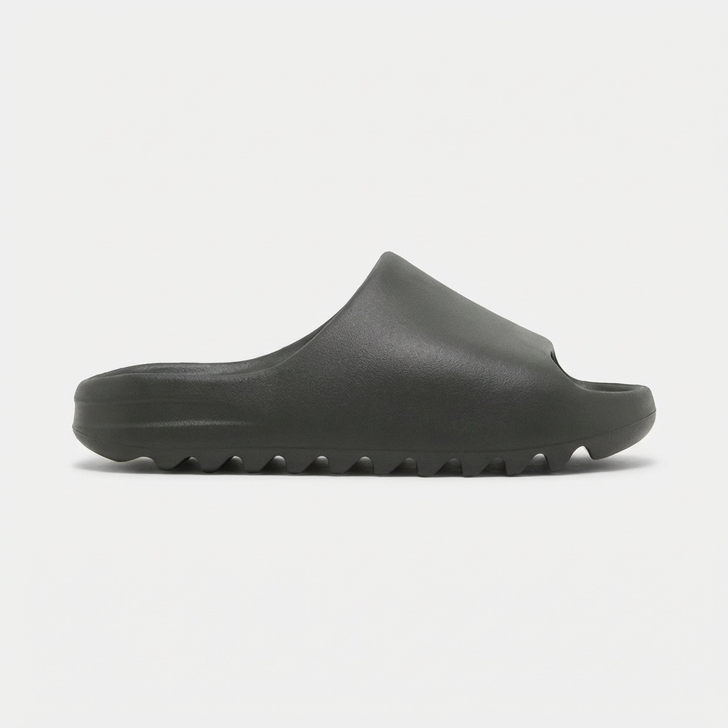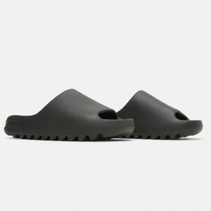 Adidas Yeezy Slide slippers in Dark Onyx color made from EVA foam. Minimalist design with ergonomic sole ensuring comfort. Universal graphite shade matches various outfits.