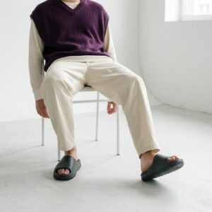 Adidas Yeezy Slide Dark Onyx slippers are made entirely from lightweight EVA foam in graphite shade. They feature uniform construction without additional decorative elements. Ergonomic sole with ribbing provides grip and wearing comfort.