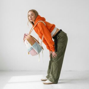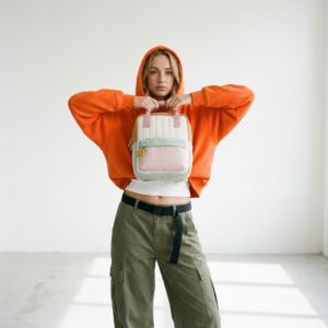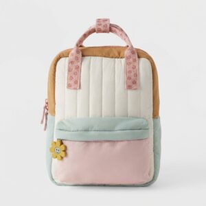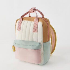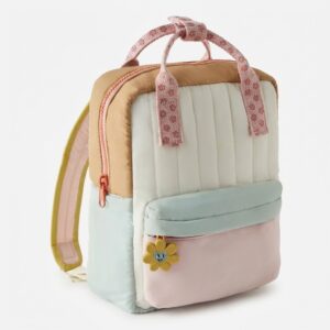 Backpack with geometric design combining pastel shades of pink, mint and cream with caramel accents. Polyester construction enhanced with patterned straps featuring floral motif. Model offers thoughtful space organization with zippers securing contents.