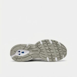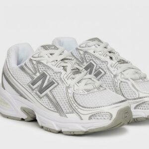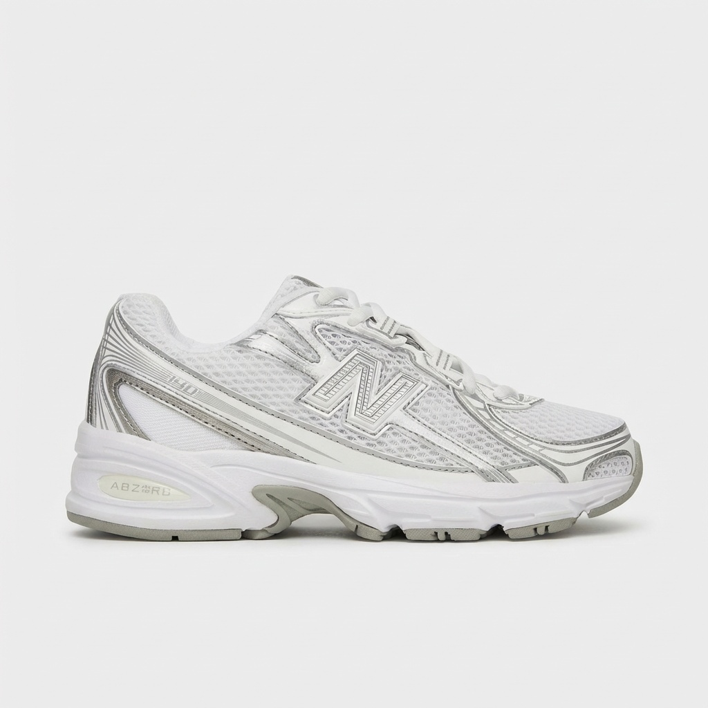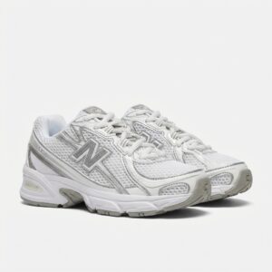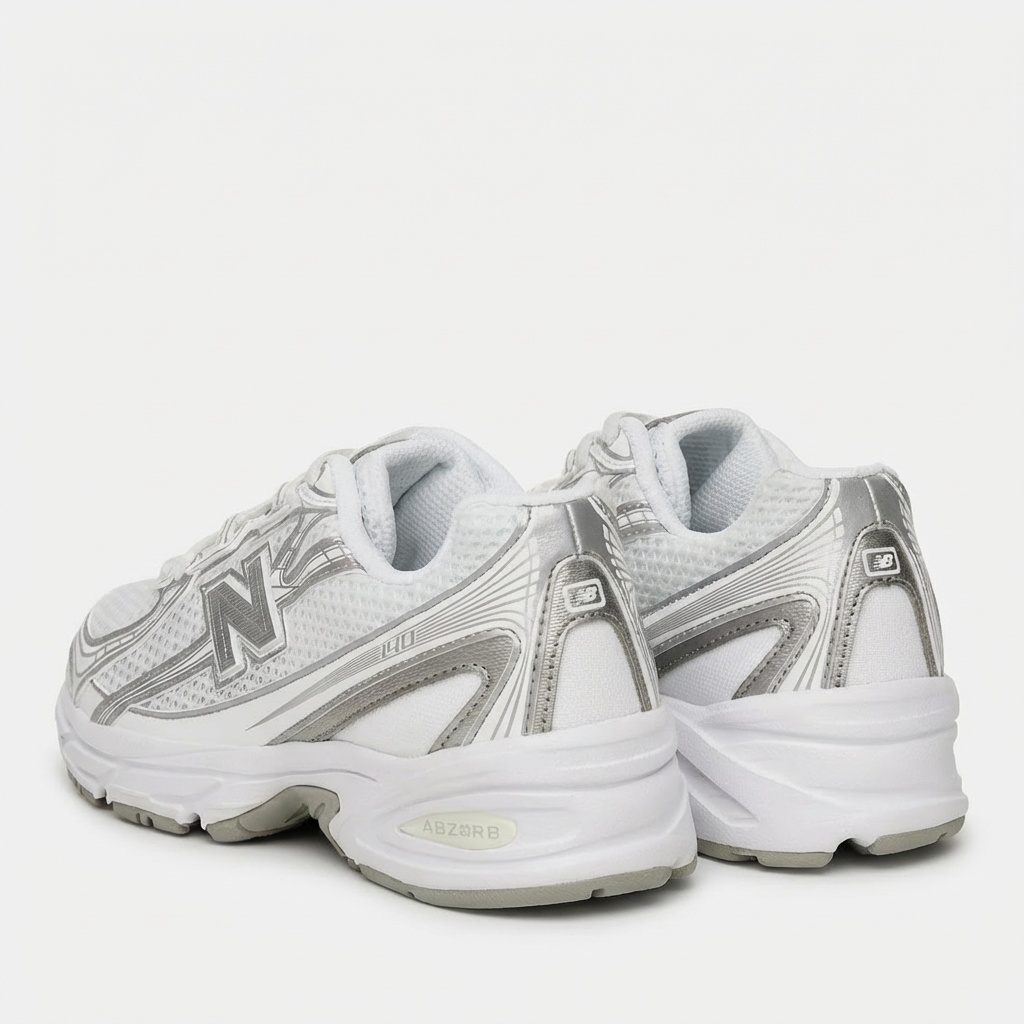 New Balance 740 sports shoes in white-silver colorway. Made from textile materials with synthetic additions. Equipped with cushioning soles and ventilating mesh panels.