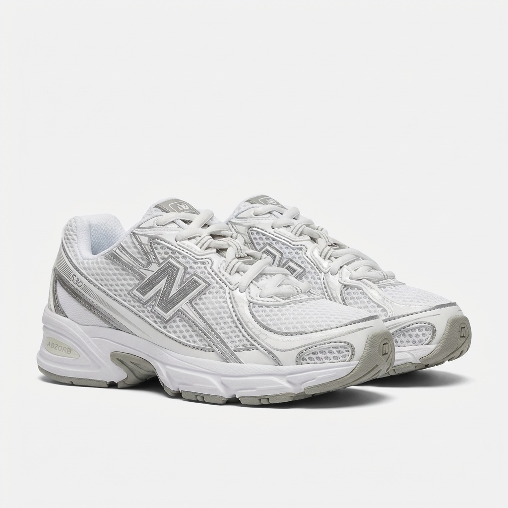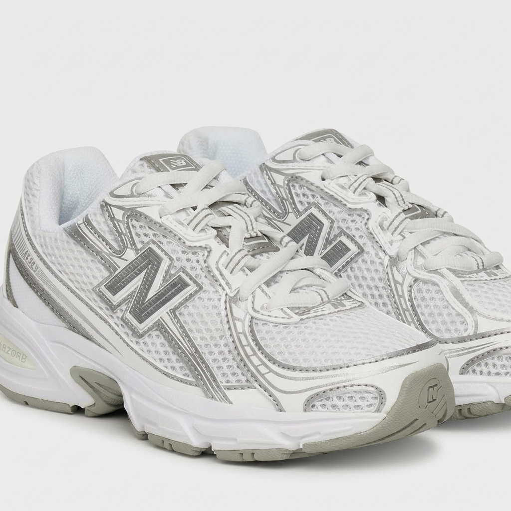 New Balance 740 sports shoes combine functionality with classic design. White-silver colorway with contrasting details works well in everyday styling. Textile upper with synthetic inserts provides breathability and durability.