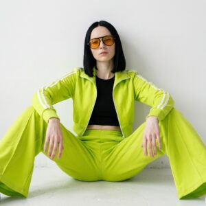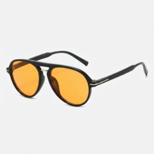 Aviator-style sunglasses with distinctive orange lenses and black frames. Made of lightweight polymer with metal details on the bridge and temples. Lenses equipped with UV400 filter providing full protection against UV radiation.