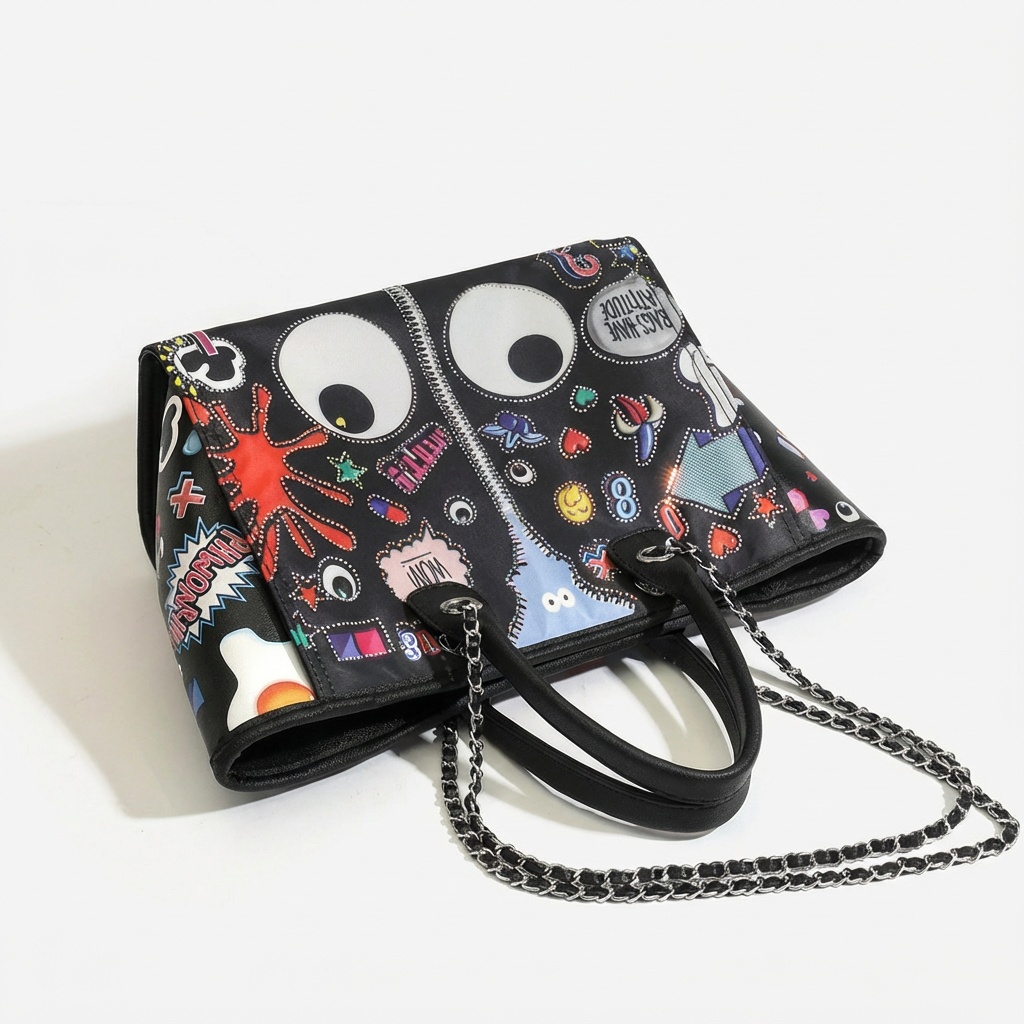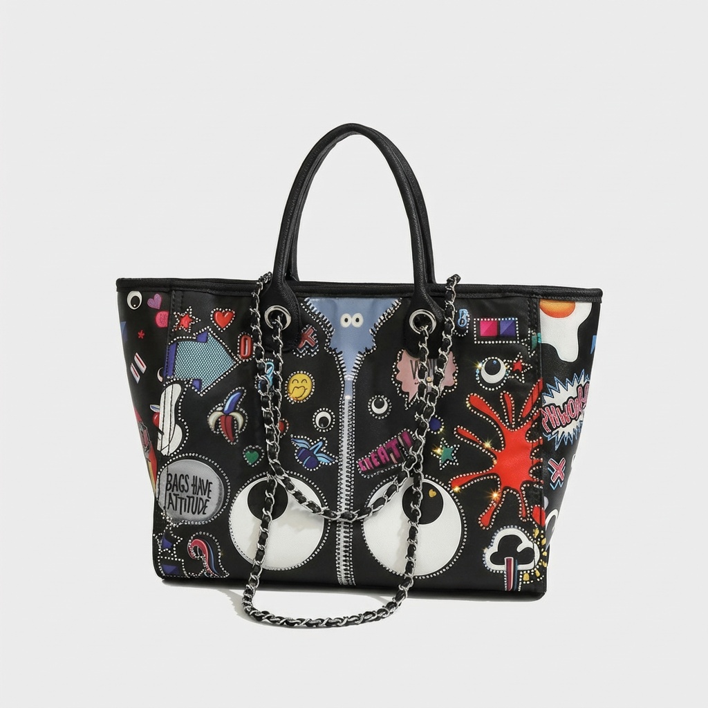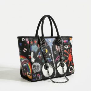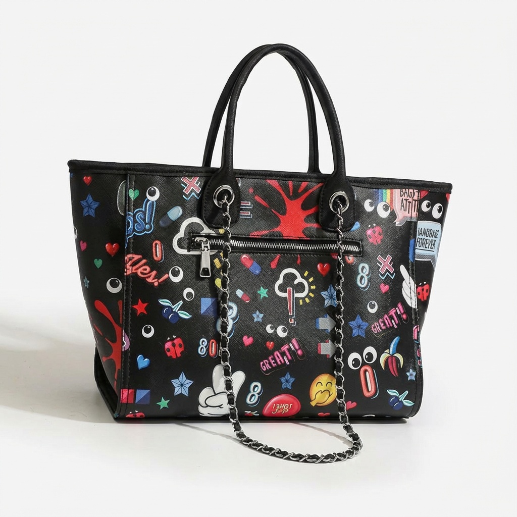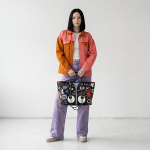 MoMyy shopper combines functionality with expressive design inspired by street art culture. Black base with multicolor graphic elements creates a distinctive accent for everyday styling. Made from eco-leather and textile material ensures durability and comfort of use.
