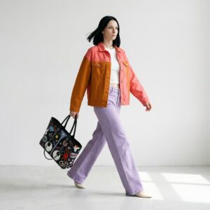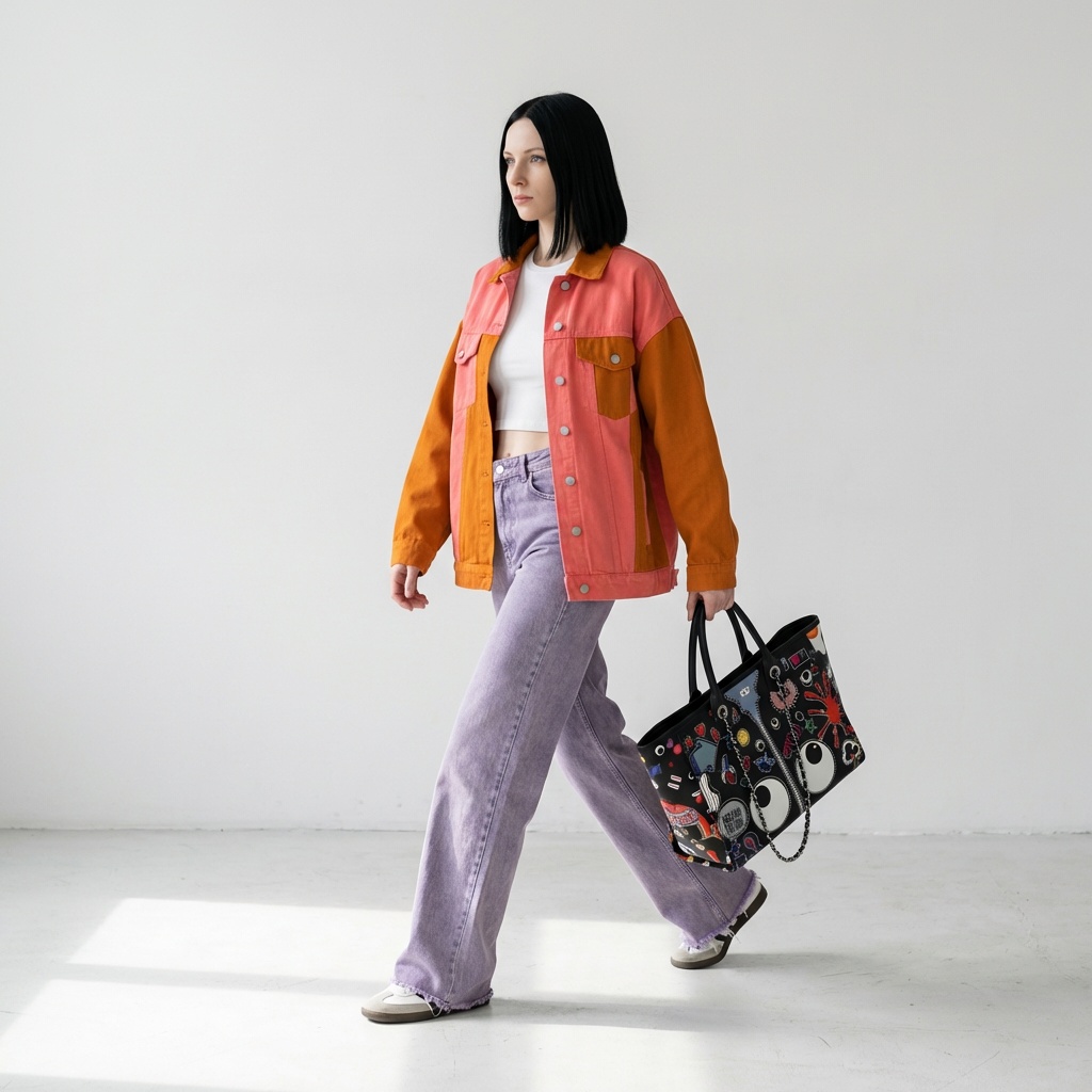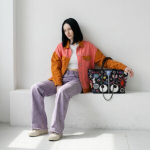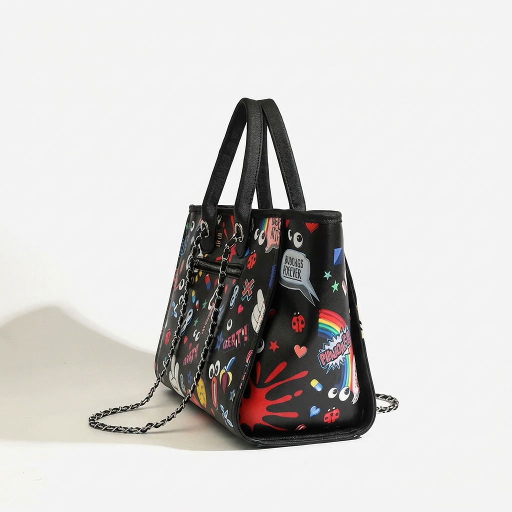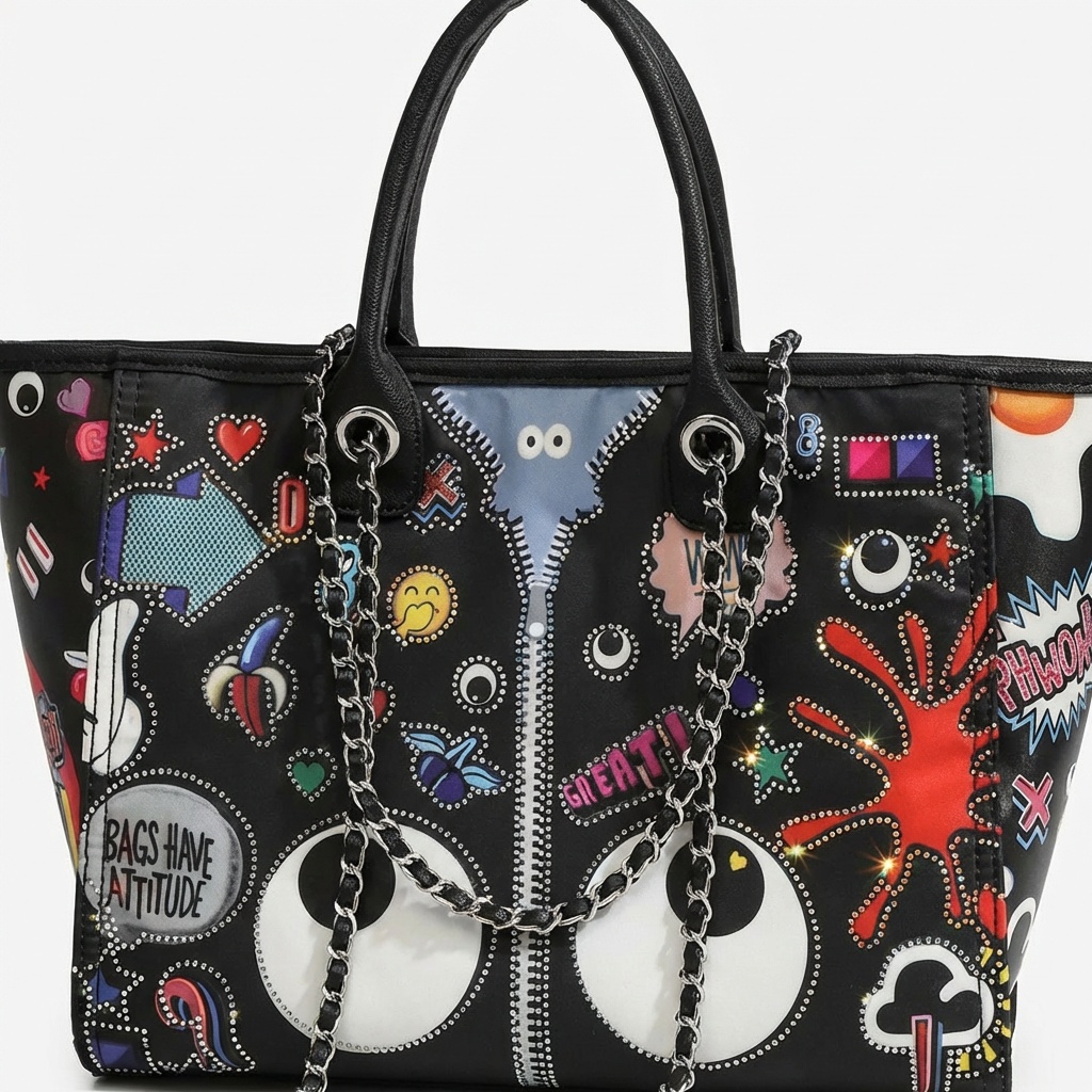 MoMyy shopper combines functionality with expressive design inspired by street art culture. Black base with multicolor graphic elements creates a distinctive accent for everyday styling. Made from eco-leather and textile material ensures durability and comfort of use.