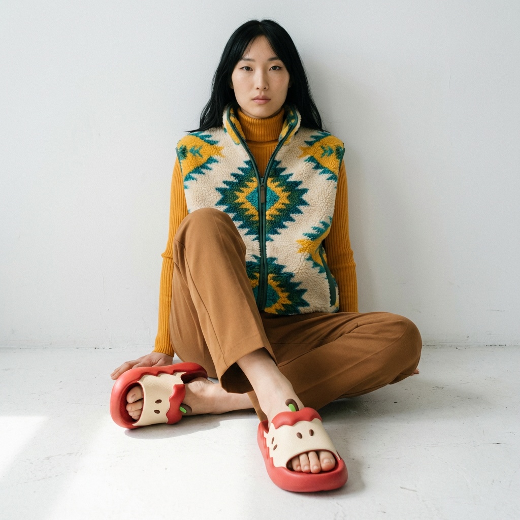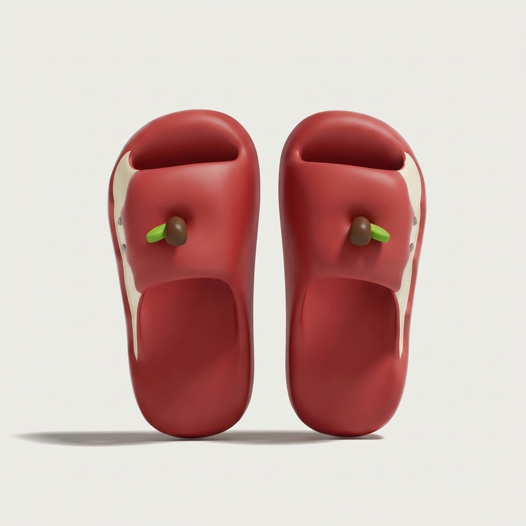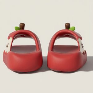 Slippers in original pattern resembling apple cross-section. Made from lightweight EVA foam characterized by red base with white elements imitating flesh and brown stem. Designer form combines functionality with unusual, artistic appearance.