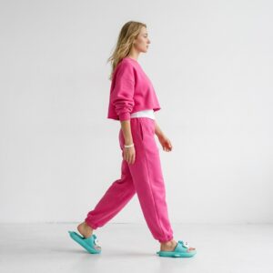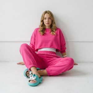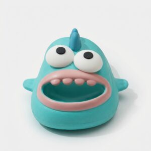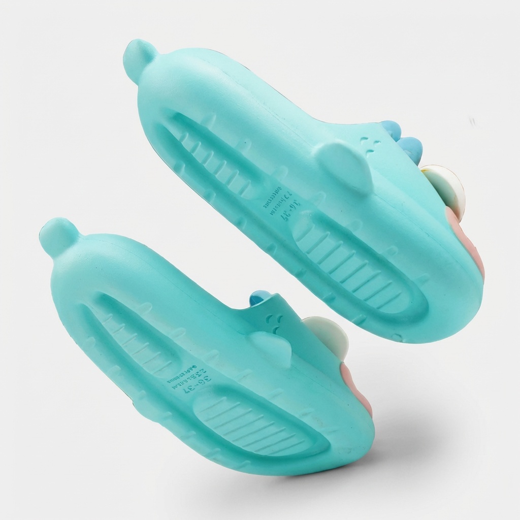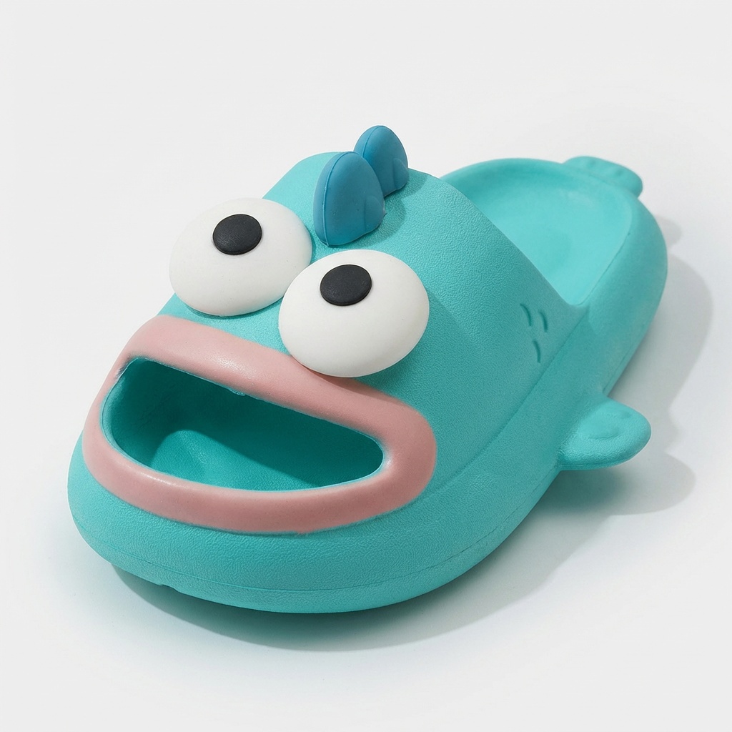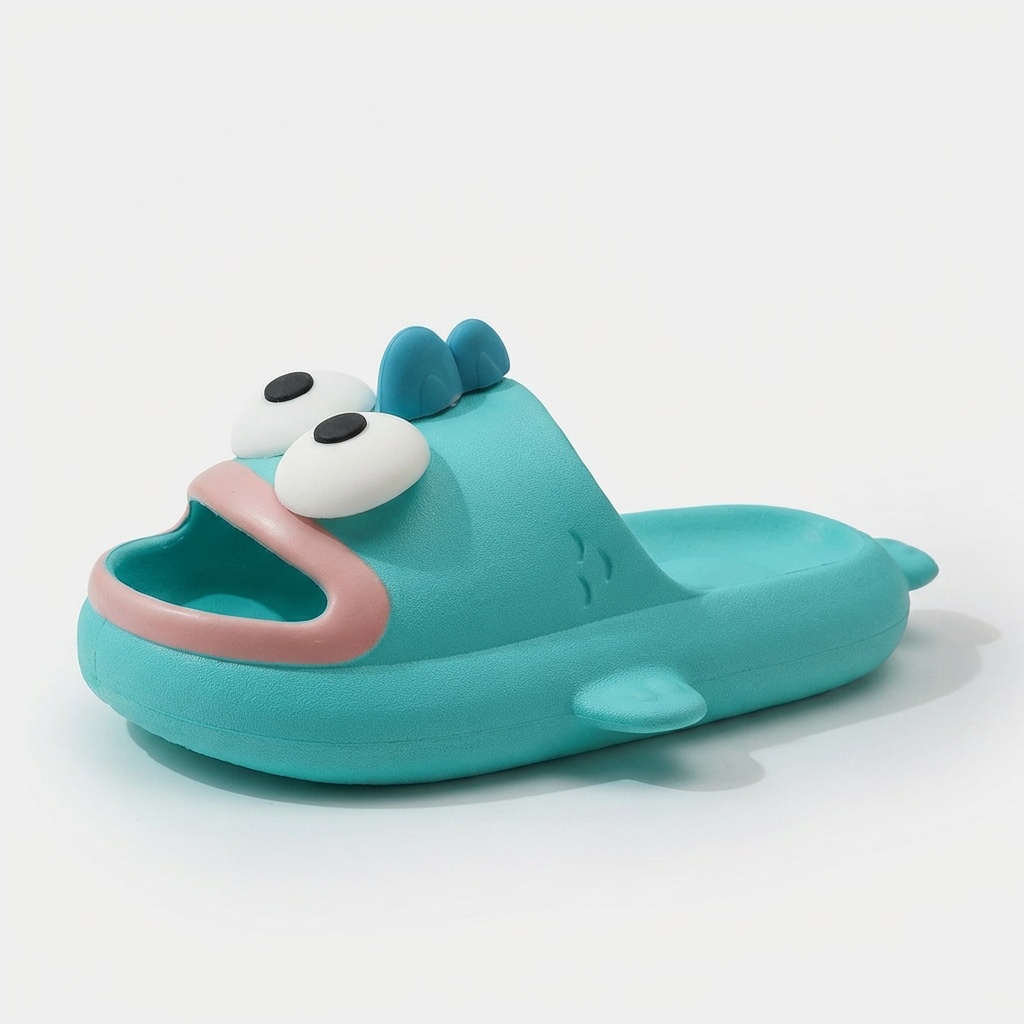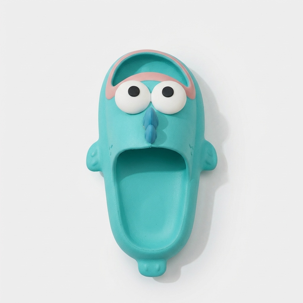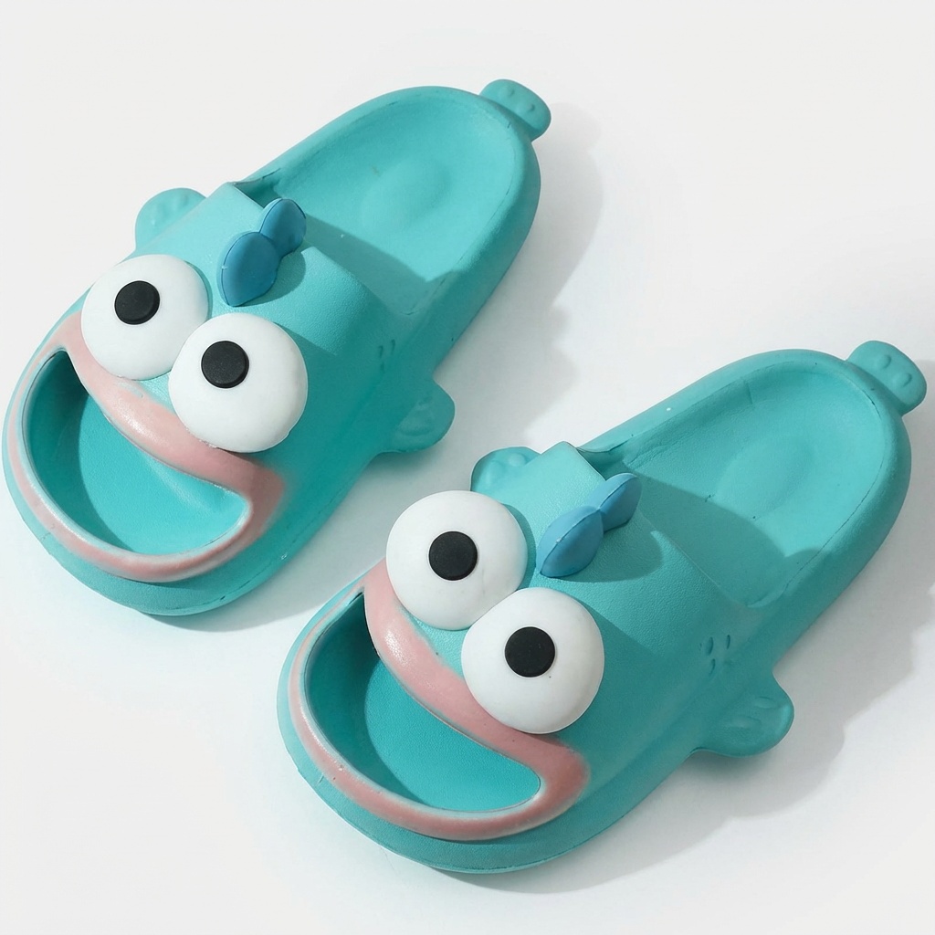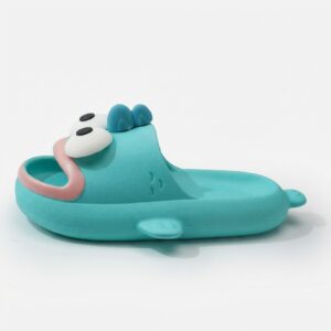 Slippers with original design featuring a cartoon character in turquoise color scheme. Made from lightweight EVA foam, which provides cushioning and comfort during everyday use. The model features a three-dimensional application of the character’s head with white eyes and pink tongue.